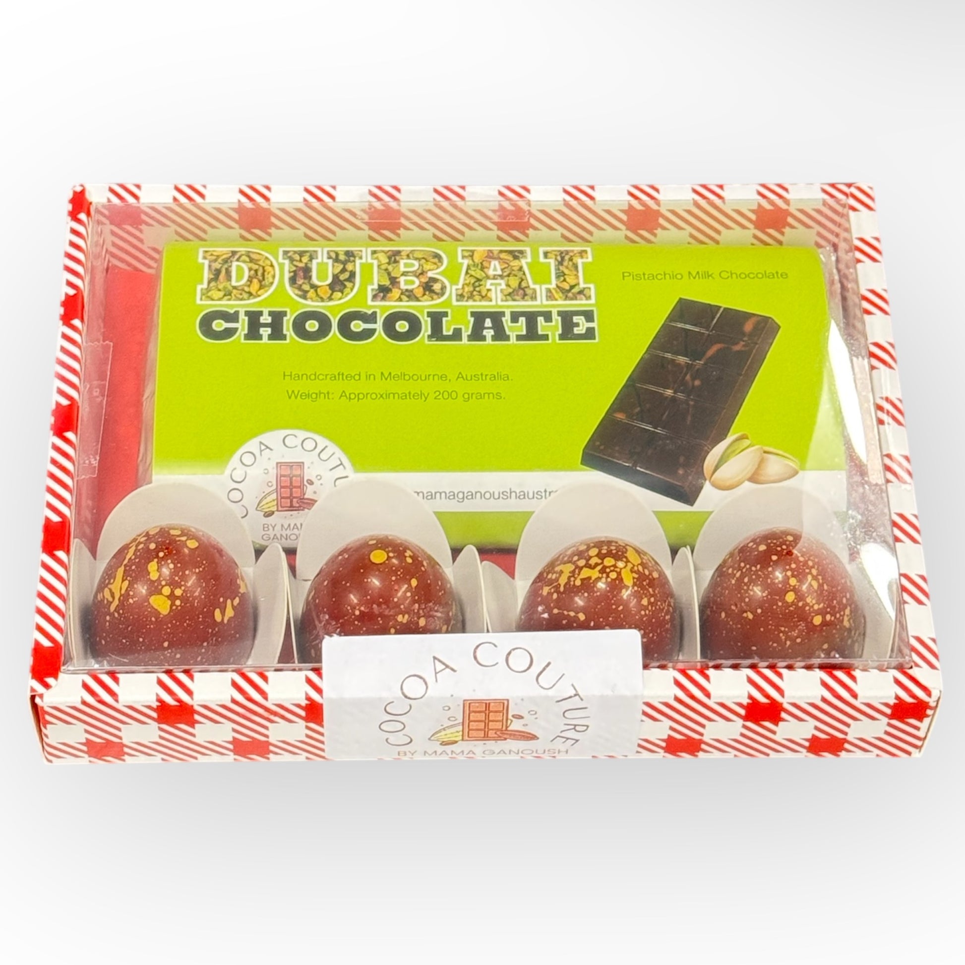 1. A Dubai Chocolate bar with pistachio milk chocolate. The label mentions it is handcrafted in Melbourne, Australia, with an approximate weight of 200 grams.